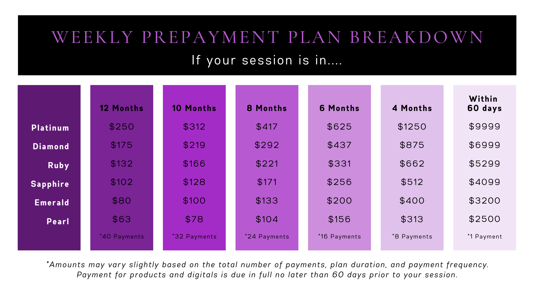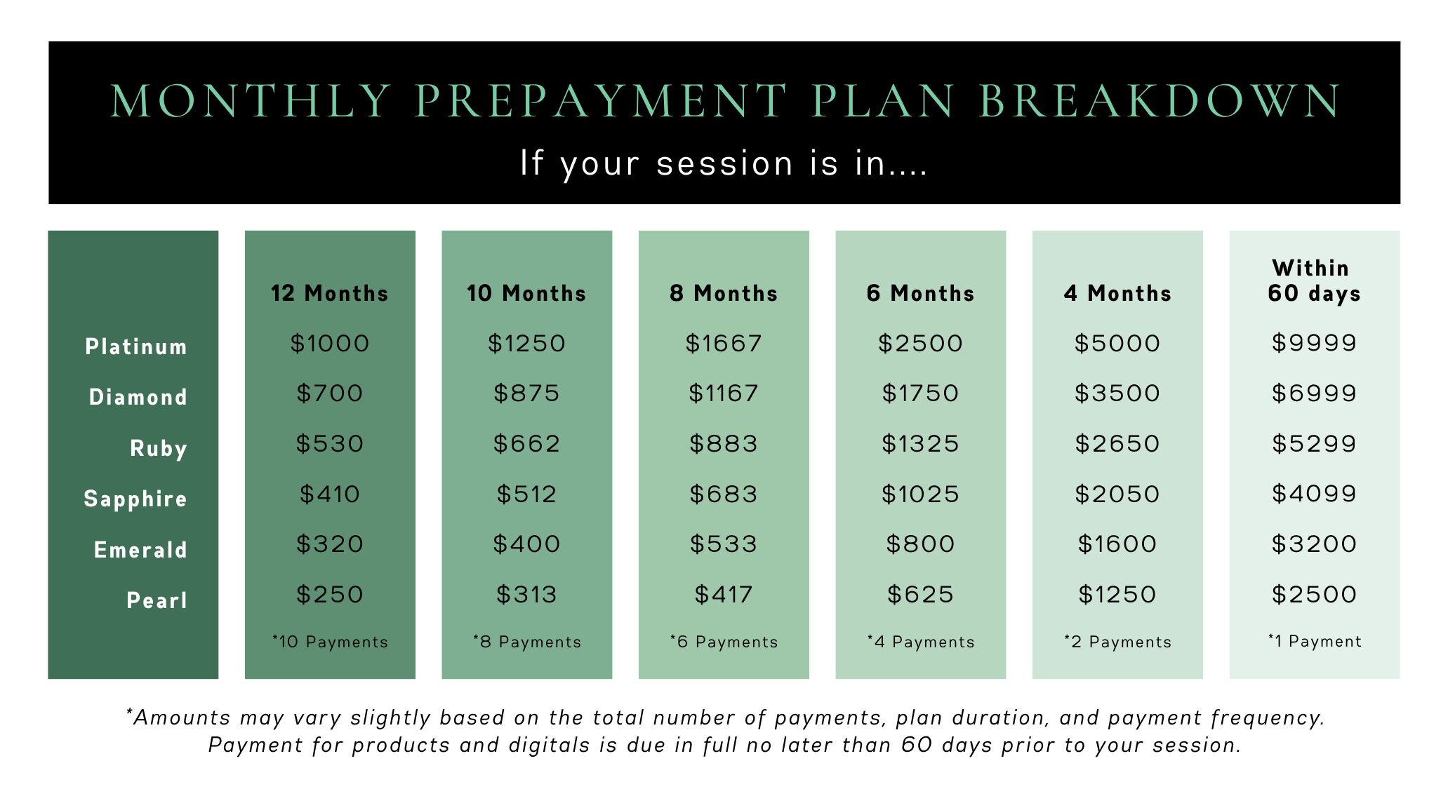 A prepayment plan is a simple, stress-free way to finance your products with zero interest leading up to your session. Once you’ve selected the products you’d like to prepay for within the Investment Guide, you’ll be able to customize your prepayment plan by choosing the payment frequency that works best for you.