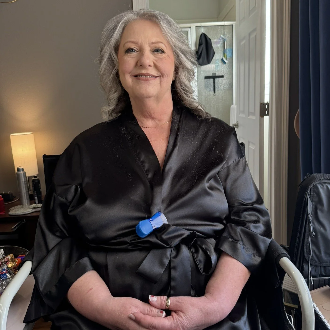 Our hair and makeup artist arrives at the same time you do, so while she’s getting set up, we’ll chat through your outfits and pull anything you’d like from the client closet. Easy, relaxed, and right on schedule.